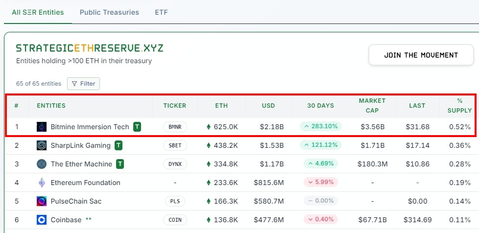 Bitmine Immersion Technologies,美国上市公司,原为比特币矿商,2025 年转型为以太币储备机构。