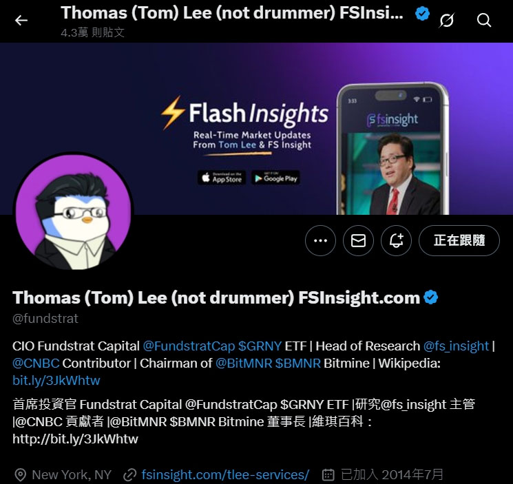 Bitmine 转型背后的推手,是资深华尔街分析师Tom Lee。他是Fundstrat Global Advisors 的共同创办人,以前瞻性的加密市场预测闻名。