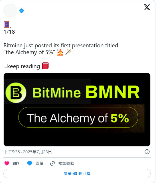 此外,Bitmine 同日发表最新企业简报《The Alchemy of 5%》,并推出影片节目《The Chairman's Message》,进一步强化市场沟通与品牌定位。