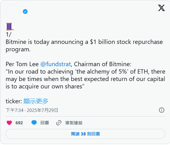 为稳定市场预期与强化资产价值支撑,Bitmine 于2025 年7 月28 日宣布启动规模高达10 亿美元的股票回购计画,并已由董事会批准。该计画为开放式机制,允许公司依市场状况,于公开市场与协议交易中回购流通股。