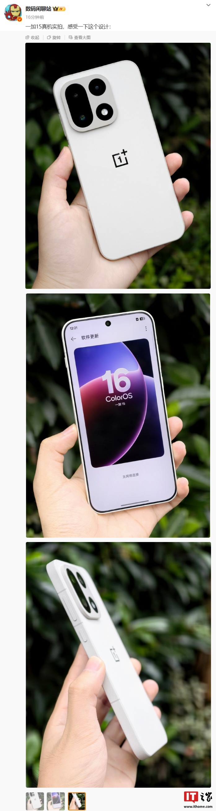 alixixi 9 月 28 日消息,博主 @数码闲聊站 今日分享了一加 15 真机实拍图。从图片来看,一加 15 采用四等边大 R 角直屏 + 直角边框设计,背面左上角为矩阵 Deco,设计风格延续一加 13T,不再和哈苏联名(一加创始人刘作虎 Pete 此前在海外一加社区宣布一加与哈苏在影像方面的合作已告结束)。
