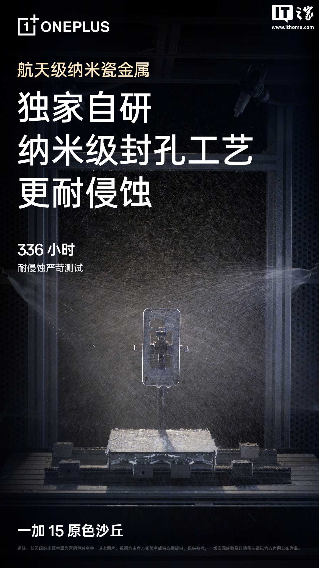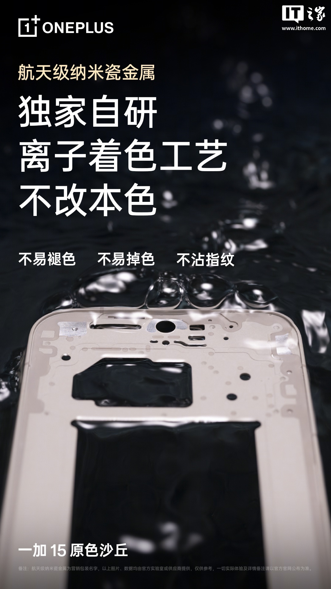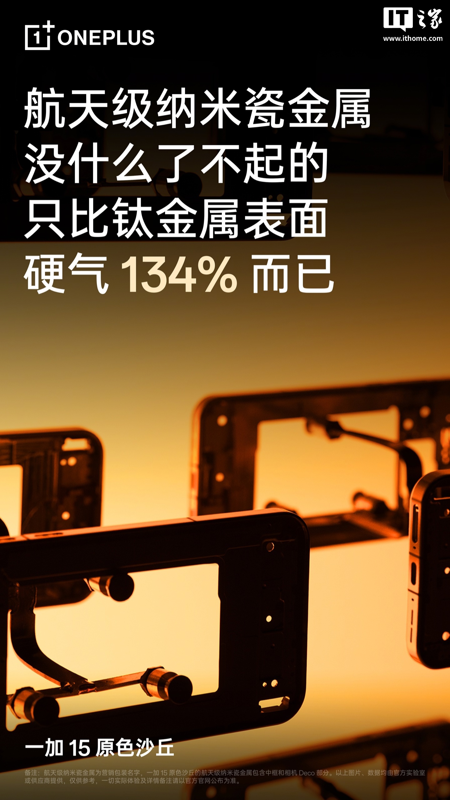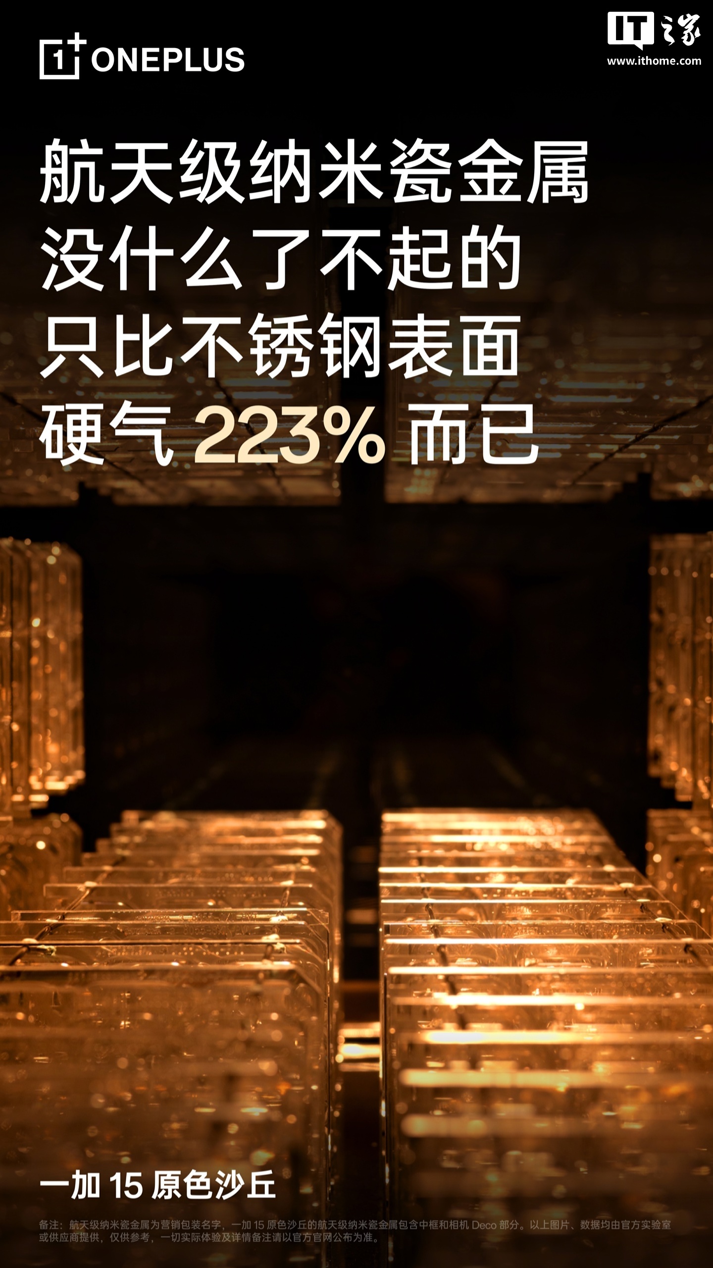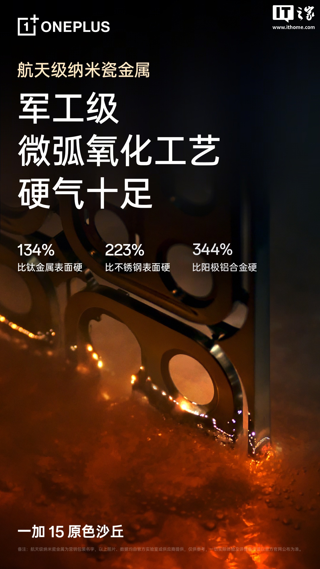 据alixixi今日早些时候报道,一加 15「原色沙丘」配色将首发「航天级纳米瓷金属」中框,带来全球领先的三大复杂工艺:军工级的微弧氧化工艺、独家自研的离子着色工艺、独家自研的纳米级封孔工艺,比钛金属更轻盈、更耐磨、散热更出色。