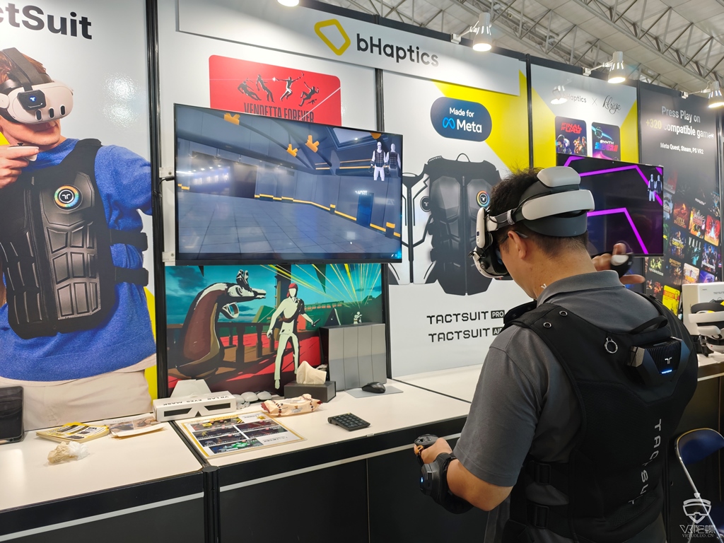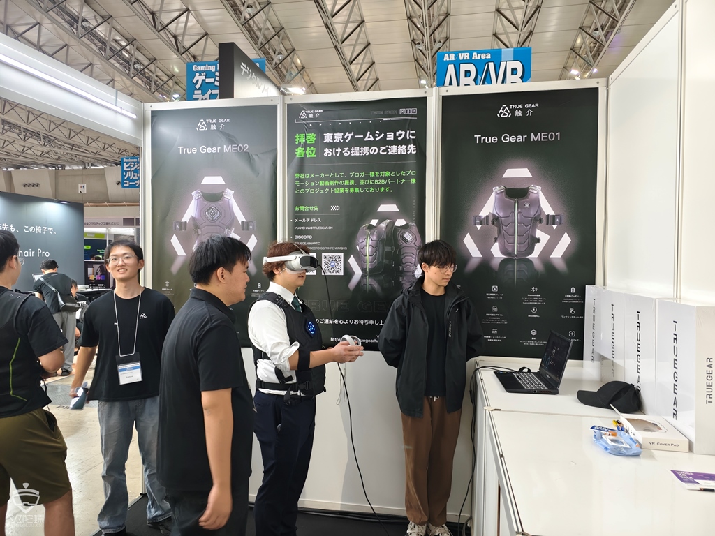 韩国企业bHaptics是TGS的常客,今年展出了2款体感背心:TactSuit Air为轻度入门款,重量1.12kg,配有16个ERM电机,续航时间12小时;TactSuit Pro面向专业玩家,重量1.87kg,配有32个ERM电机,续航时间13.5小时——两款都是Meta官方认证的产品,完全兼容Quest系列头显。