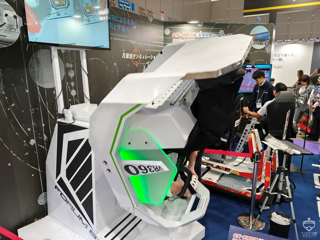 日本的3D软件生产商FORUM8主要开发并提供各种交互式3D VR仿真、建模和工程软件。现场展示的是曾在大阪·关西世博会机器人体验区出展的《VR月球与宇宙虚拟体验》(VRによる月と宇宙のバーチャル体験)。借助VR头显和可360度旋转的座椅,用户能体验月球表面行走、太空建设,以及在国际空间站“希望号”舱内漫游。