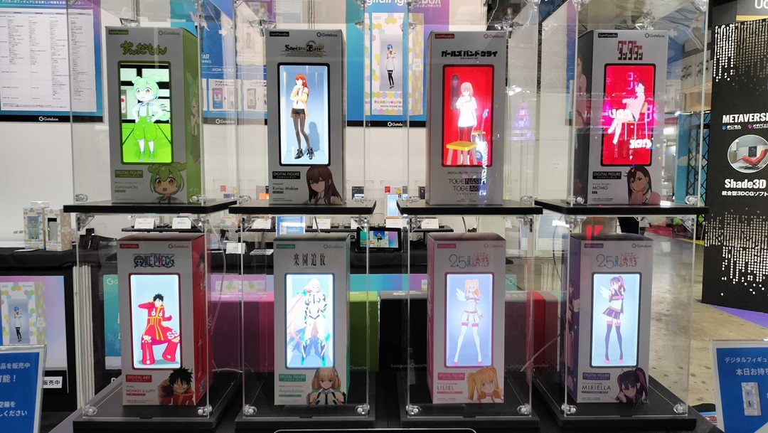 公司的主打产品DigitalFigure Box是一种数字人偶专用显示器,使用专门的Android应用展示VRM模型,数字人偶在屏幕中可以做出各种动作、姿势,显得更为生动。现场展示并销售 《命运石之门》《2.5次元的诱惑》《乐园追放》《海贼王》《超自然武装当哒当》等IP的数字人偶盒。