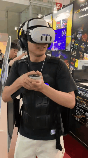 现场提供的《ZOMBIE STORM》是一款可供多人线下共同游玩的“团队生存XR射击游戏”(TGS只能1人游玩),玩家们需要搭配VR头显、枪型控制器和体感服来游玩,迎战丧尸大军和强大的BOSS。此外他们还有《Battle World 2045》和《SAMURAI:XR 蒼天綺譚》等作品。