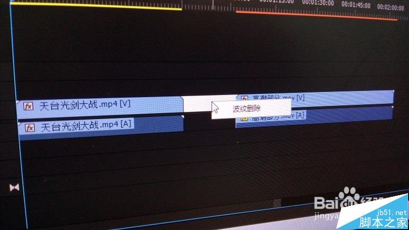 6、点击时间轴上的磁铁图标,能快速地把视频粘黏。还可在两个视频的之前空白的位置点击右键--波纹删除,快速地把两视频首尾连接。