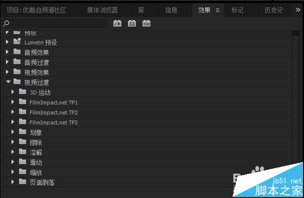 7、对视频添加过渡效果。PR自带有很多视频过渡效果,点击左下角窗口上的效果--视频过渡拖拽里面效果到视频的头或者尾,或者两视频之间,就能实现过渡效果(音频在PR里的剪辑,添加过渡效果的方法与视频相像)。