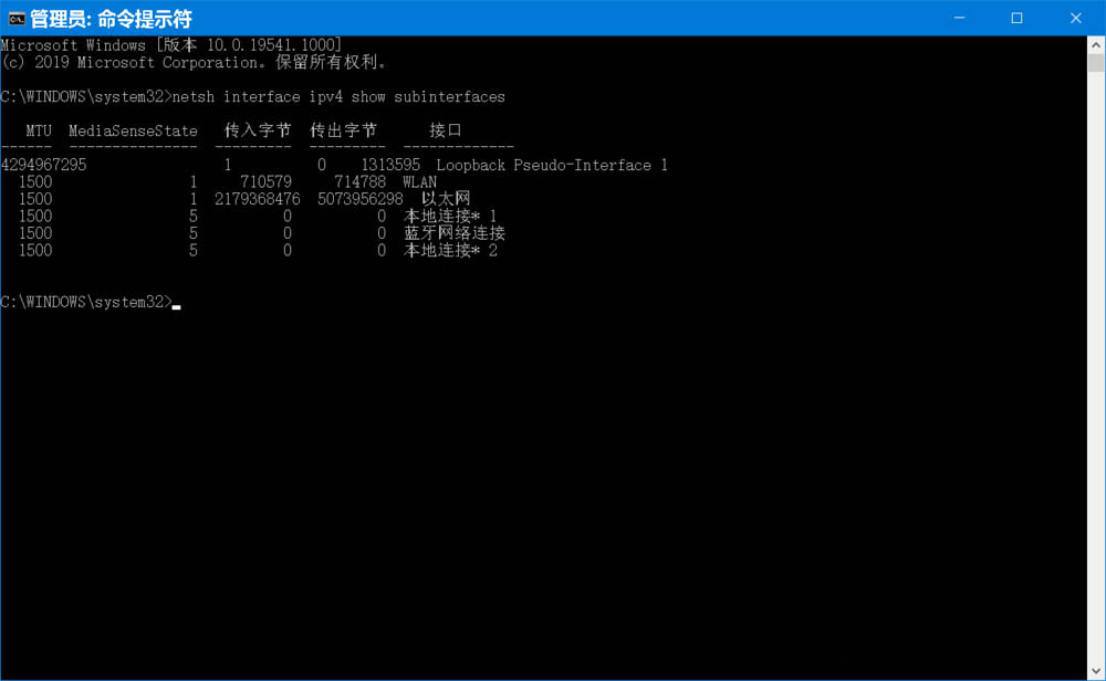 2、复制命令:netsh interface ipv4 show subinterfaces 到命令提示符窗口中,然后按下键盘上的回车键,即可查看到系统的MTU值与对应的本地连接名称: