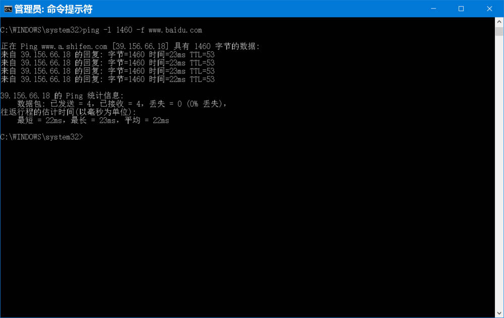C:WINDOWSsystem32>ping -l 1460 -f www.baidu.com