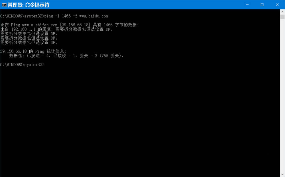 C:WINDOWSsystem32>ping -l 1466 -f www.baidu.com