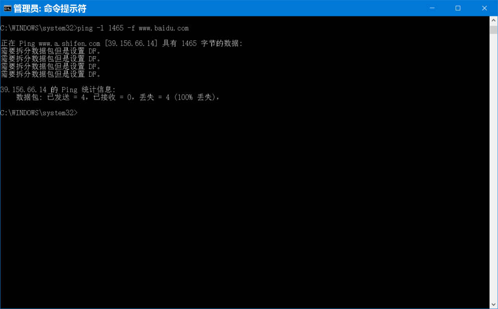 C:WINDOWSsystem32>ping -l 1465 -f www.baidu.com