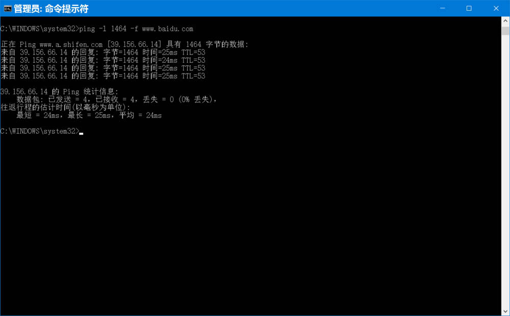 C:WINDOWSsystem32>ping -l 1464 -f www.baidu.com