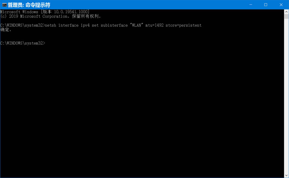 netsh interface ipv4 set subinterface "WLAN" mtu=1492 store=persistent ,复制此命令到管理员命令提示符窗口中,再按下键盘上的回车键,显示:netsh interface ipv4 set subinterface "WLAN" mtu=1492 store=persistent