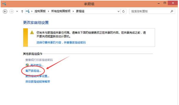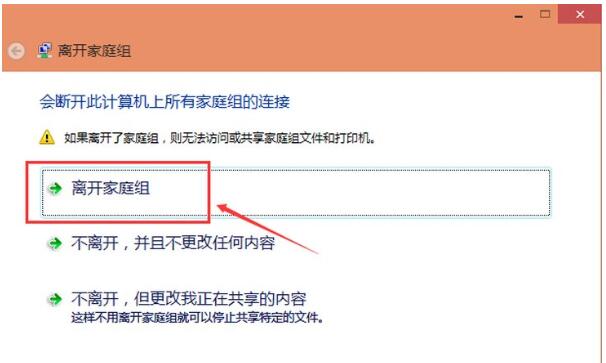 3、系统提示离开了家庭组后,则无法访问或共享家庭组文件夹和打印机,直接点击“离开家庭组”。