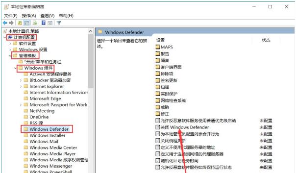 3、打开计算机配置-》管理模板-》Windows组件-》Windows Defender,在右侧可以找到“关闭Windows Defender”。