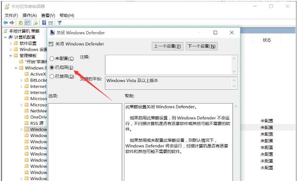 4、双击“关闭Windows Defender”,选择“已启用”,点击确定。
