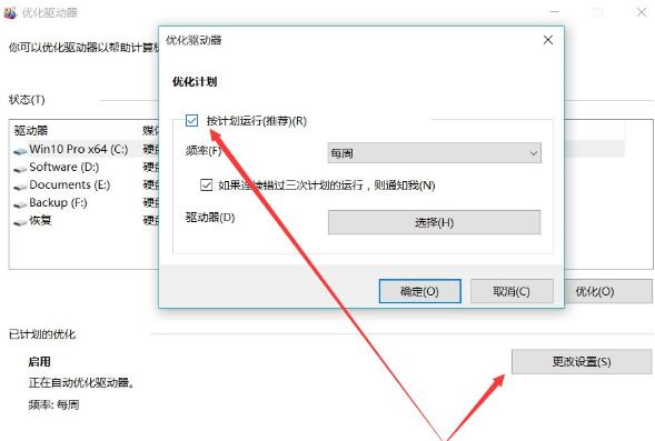 3、点击“更改设置”,将“按计划运行”前面的对号去掉。