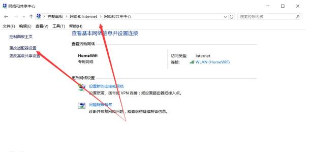 2、控制面板-》网络和Internet-》网络和共享中心,点击左侧的更改适配器设置。