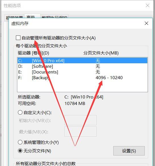 3、取消选择“自动管理所有驱动器的分页文件大小”,将虚拟内存设置在其他的分区中。