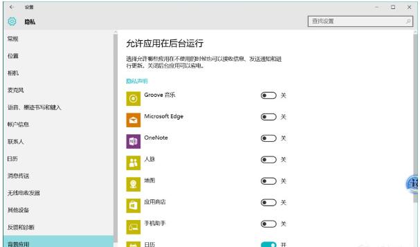 3、点击左侧的“后台应用”,关掉右侧不想后台运行的应用即可。