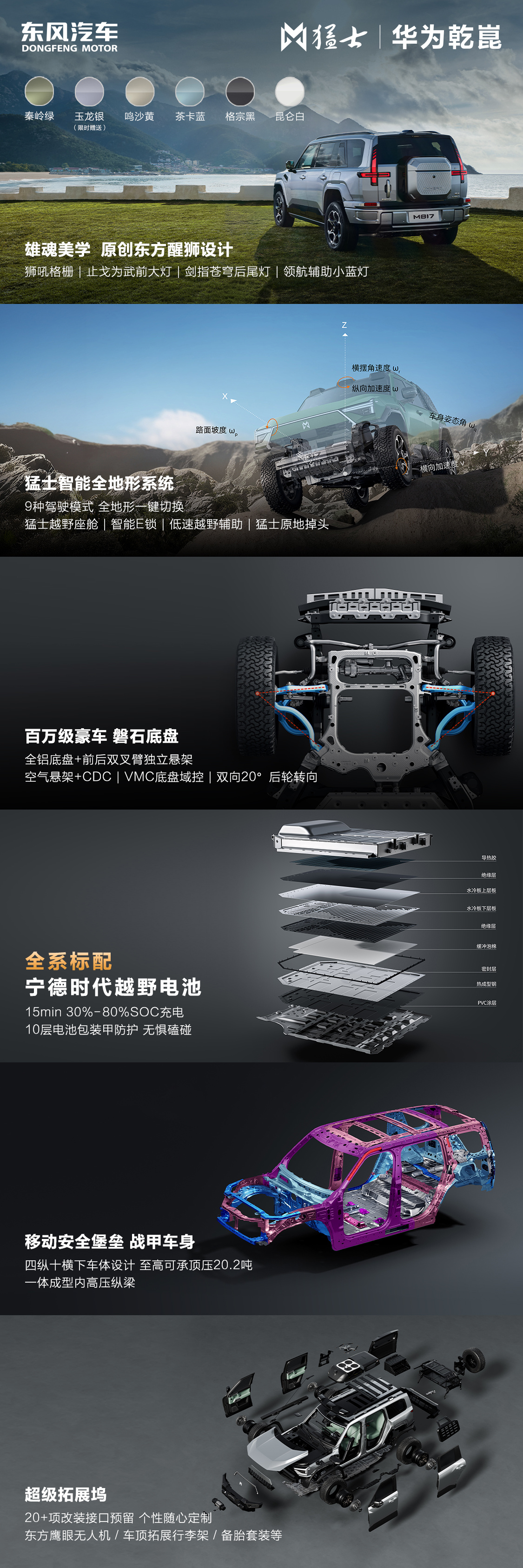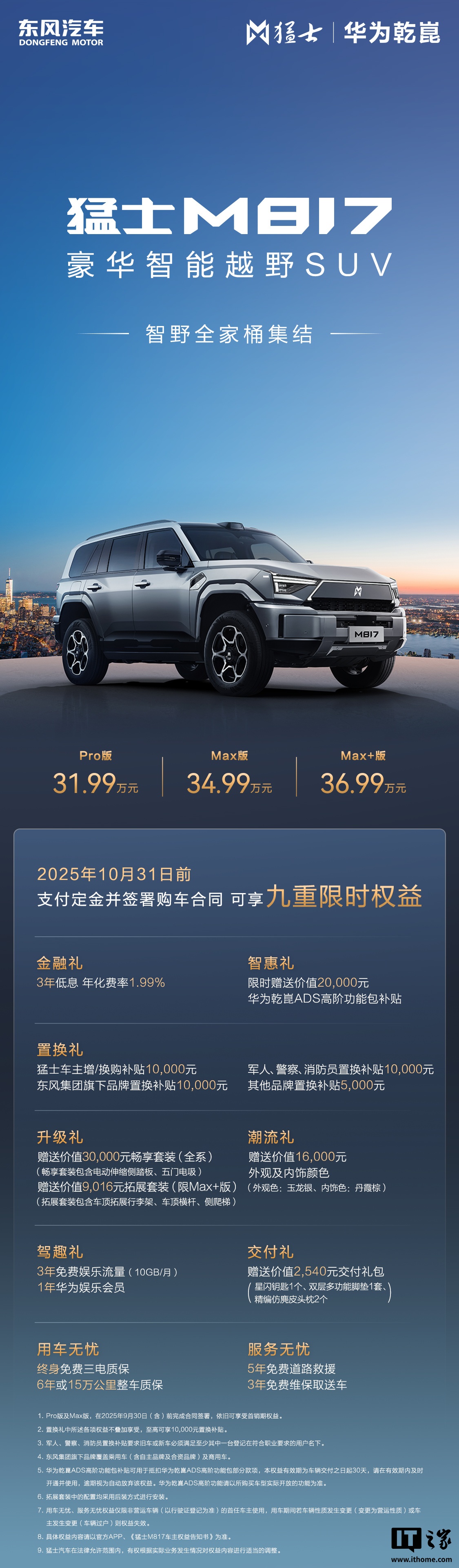 alixixi 9 月 29 日消息,东风汽车旗下猛士汽车品牌宣布旗下猛士 M817 Max + 版越野 SUV 正式上市,售价为 36.99 万元,此前已经上市的 Pro 版和 Max 版售价分别为 31.99 万元和 34.99 万元。为吸引消费者,品牌还推出了限时优惠活动:凡在 10 月 31 日前支付定金的客户,可享受包括金融礼、智慧礼、置换礼、升级礼等在内的九重限时权益。
