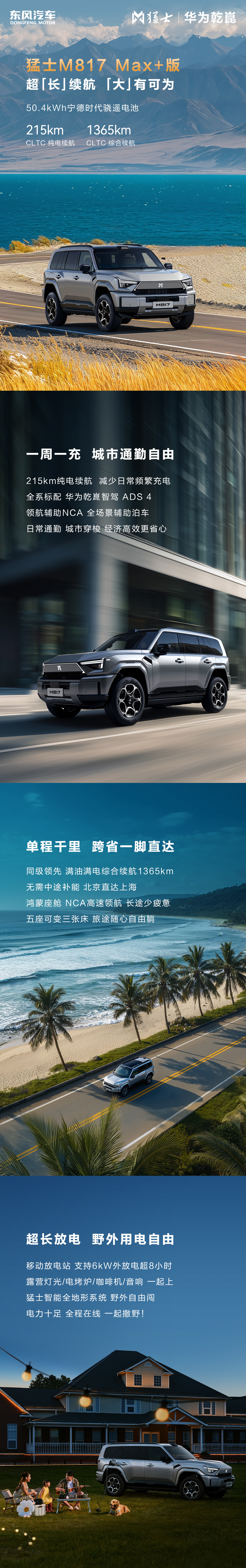 动力方面,猛士 M817 Max + 版搭载了 1.5T 发动机与电机组成的插电混动系统,综合功率达到 505 千瓦,综合扭矩为 848 牛・米。配备 50.4 千瓦时的宁德时代骁遥电池,CLTC 综合续航里程为 1365 公里。车辆采用两挡纵置 11 模 PHEV 架构以及分布式解耦四驱系统,支持燃油、纯电、增程、插混等多种驱动模式,并提供 9 种驾驶模式。