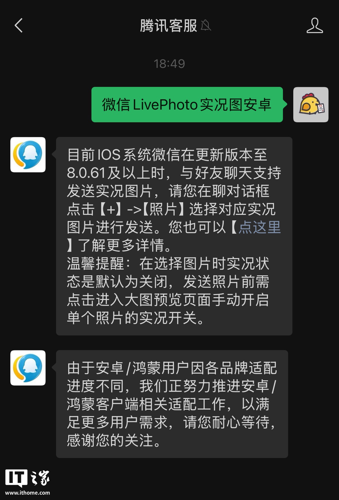 对此,微信客服表示,目前实况图已面向 iOS 用户开放,iOS 可更新至 8.0.61 及以上版本体验相应功能。对于安卓 / 鸿蒙版本,官方称由于安卓 / 鸿蒙用户因各品牌适配进度不同,开发人员正努力推进相应客户端相关适配工作,以满足更多用户需求。