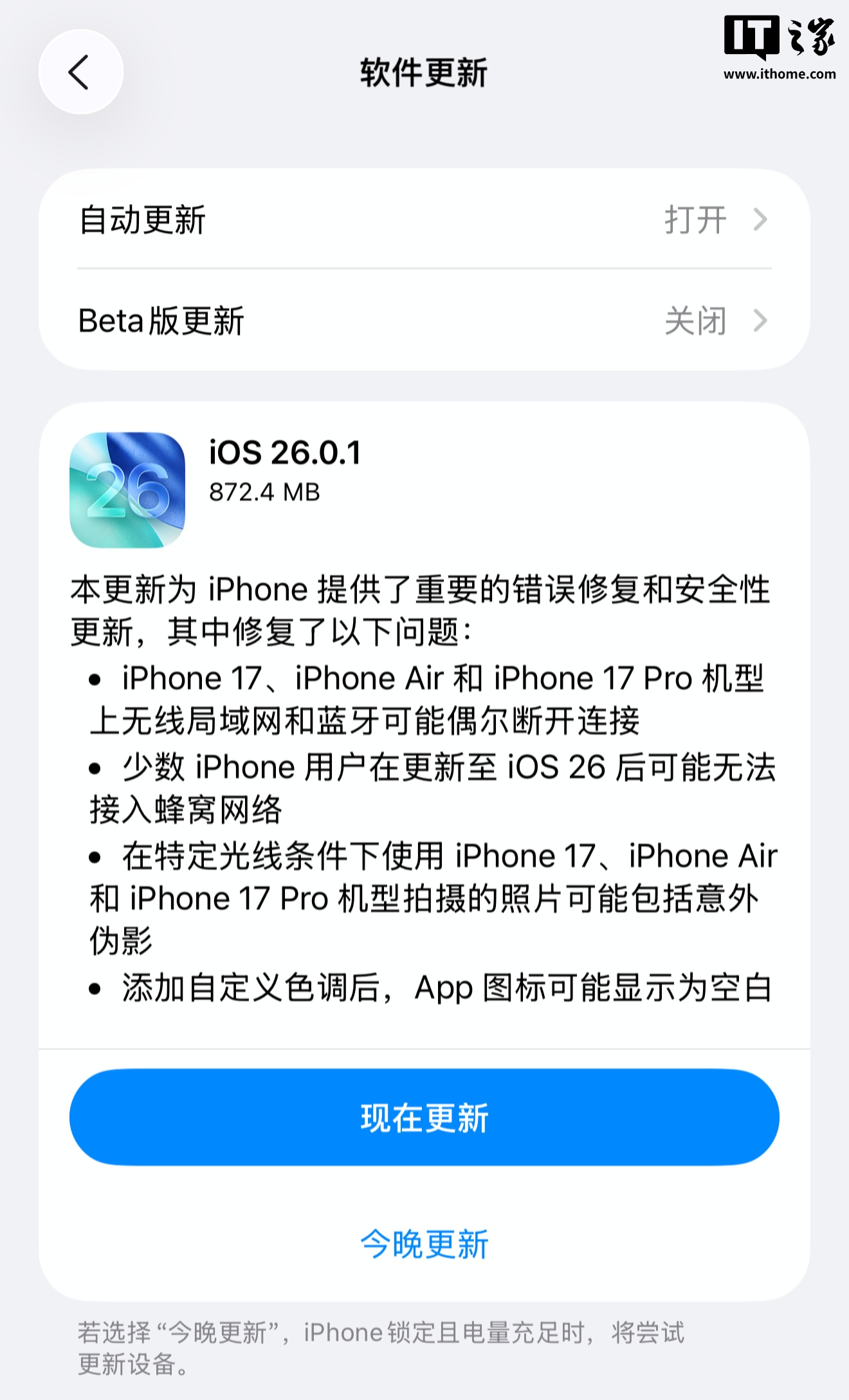 alixixi附上 iOS 26.0.1 更新官方日志内容如下: