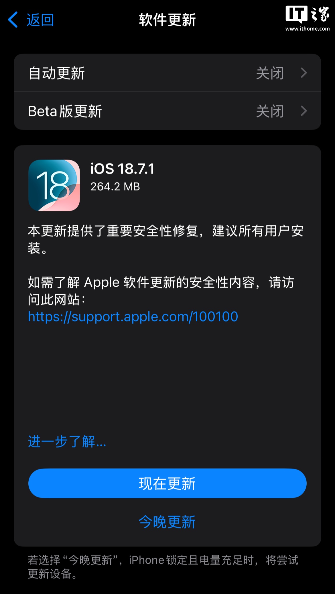 对于无法升级或者不愿意升级到 iOS / iPadOS 26 的设备,苹果还推出了 iOS 18.7.1 更新,仅显示提供了重要安全性修复,建议所有用户安装。