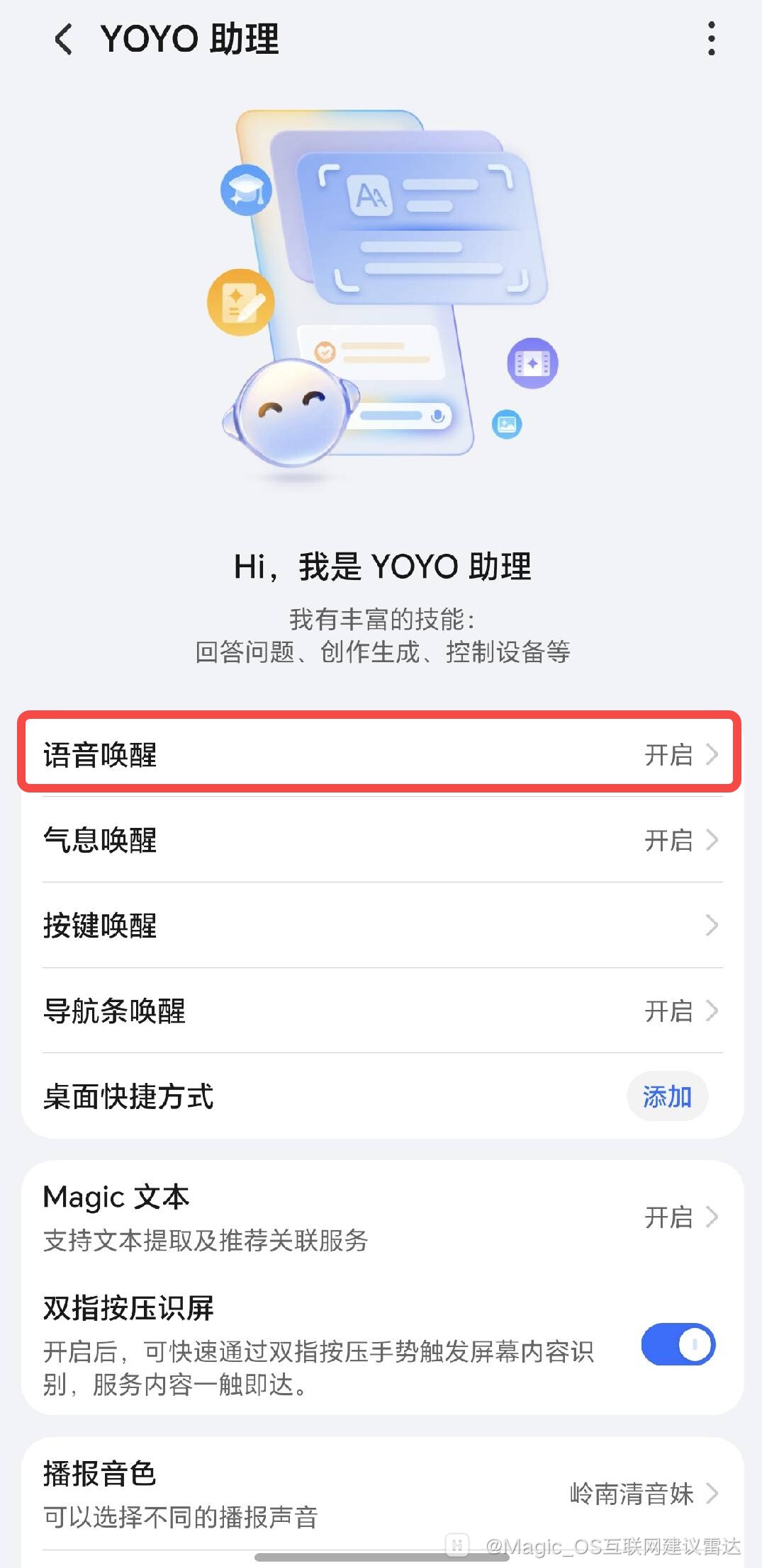 进入系统设置,搜索并进入 YOYO 助理界面,打开语音唤醒的开关。如果在 YOYO 助理界面中没有语音唤醒开关,说明您的手机 / 平板不支持此功能。