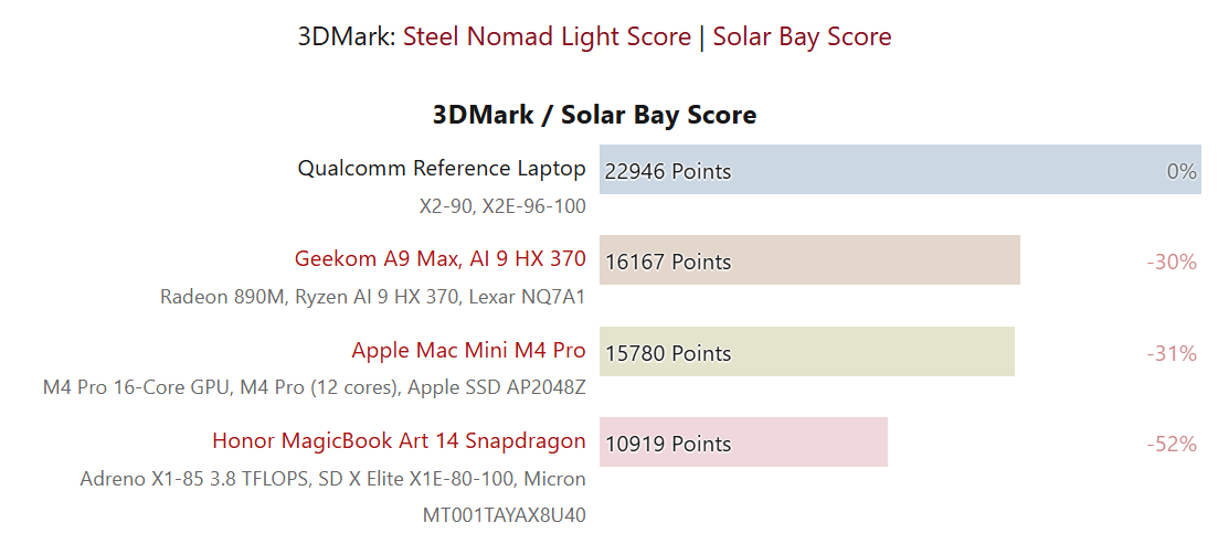 GPU 方面,骁龙 X2 Elite Extreme 是其前代产品的 2.5 倍,在 3DMark / Steel Nomad Light Score 的跑分为 5687 分,作为对比,苹果 MacBook Pro 16 M4 Max 的得分为 13989 分,超出骁龙 X2 Elite Extreme 146%。