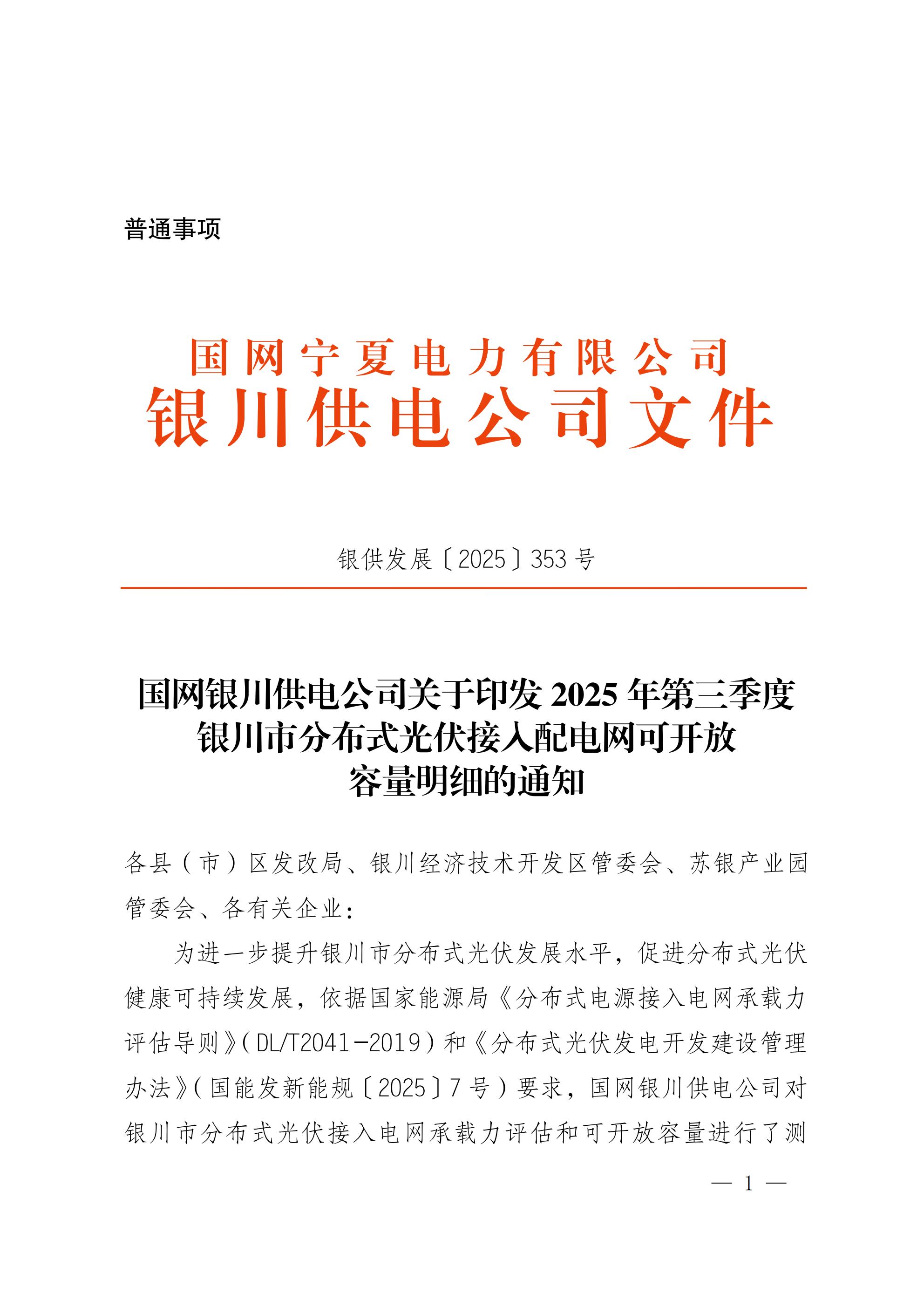 附件:银供发展〔2025〕353号国网银川供电公司关于印发2025年第三季度银川市分布式光伏接入配电网可开放容量明细的通知(盖章)