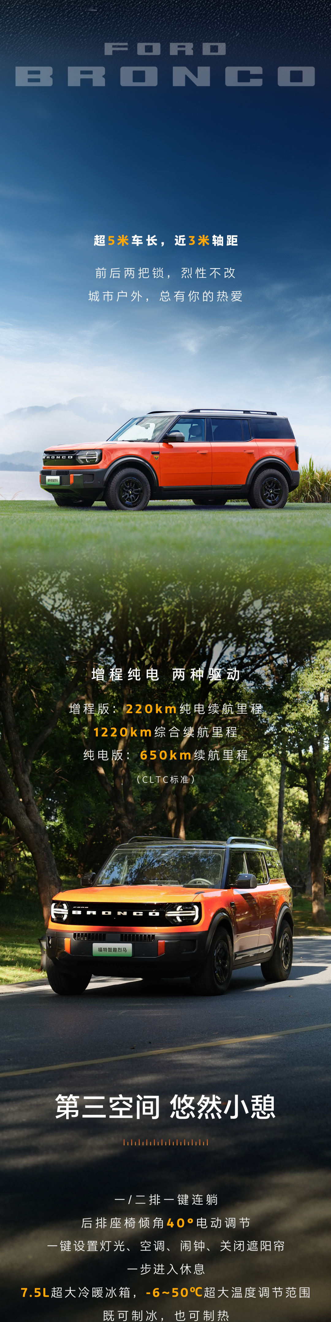 该车长度超 5 米,轴距近 3 米,配备前后两把机械式差速锁,提供增程、纯电两种动力,支持 6kW 对外放电。
