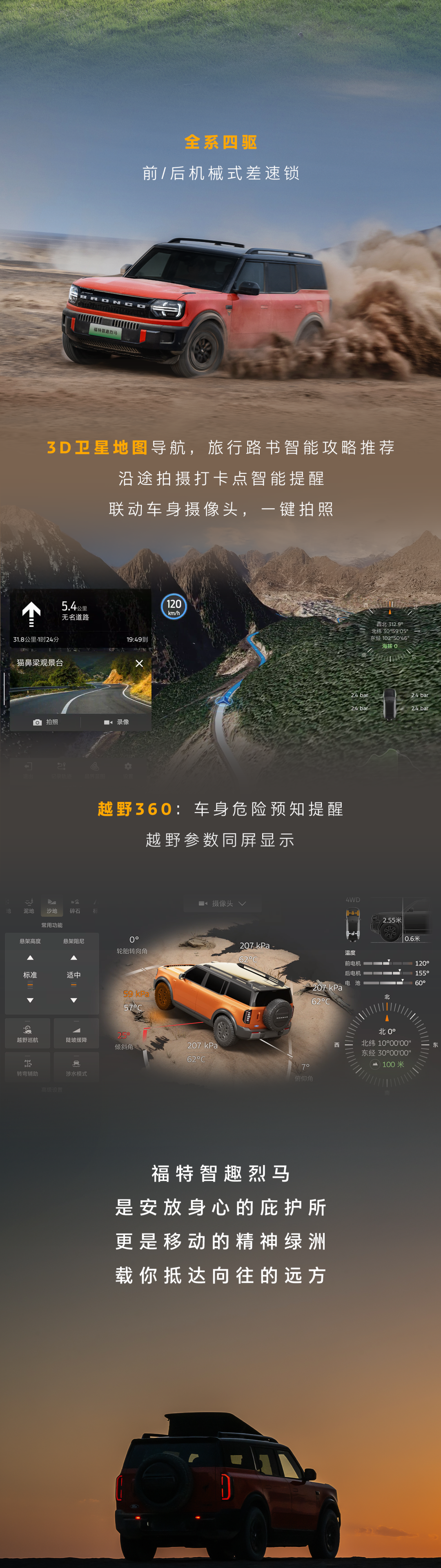 alixixi 10 月 1 日消息,今日福特智趣烈马开启盲订,支付 1000 元盲订意向金,可获赠官方价值 12000 元的“一键升顶露营套装”,包含原厂电动举升顶和前排座椅头枕一键自动翻折两项功能。福特智趣烈马提供纯电与增程两种动力选择,还配备激光雷达等多个高精度雷达传感器。