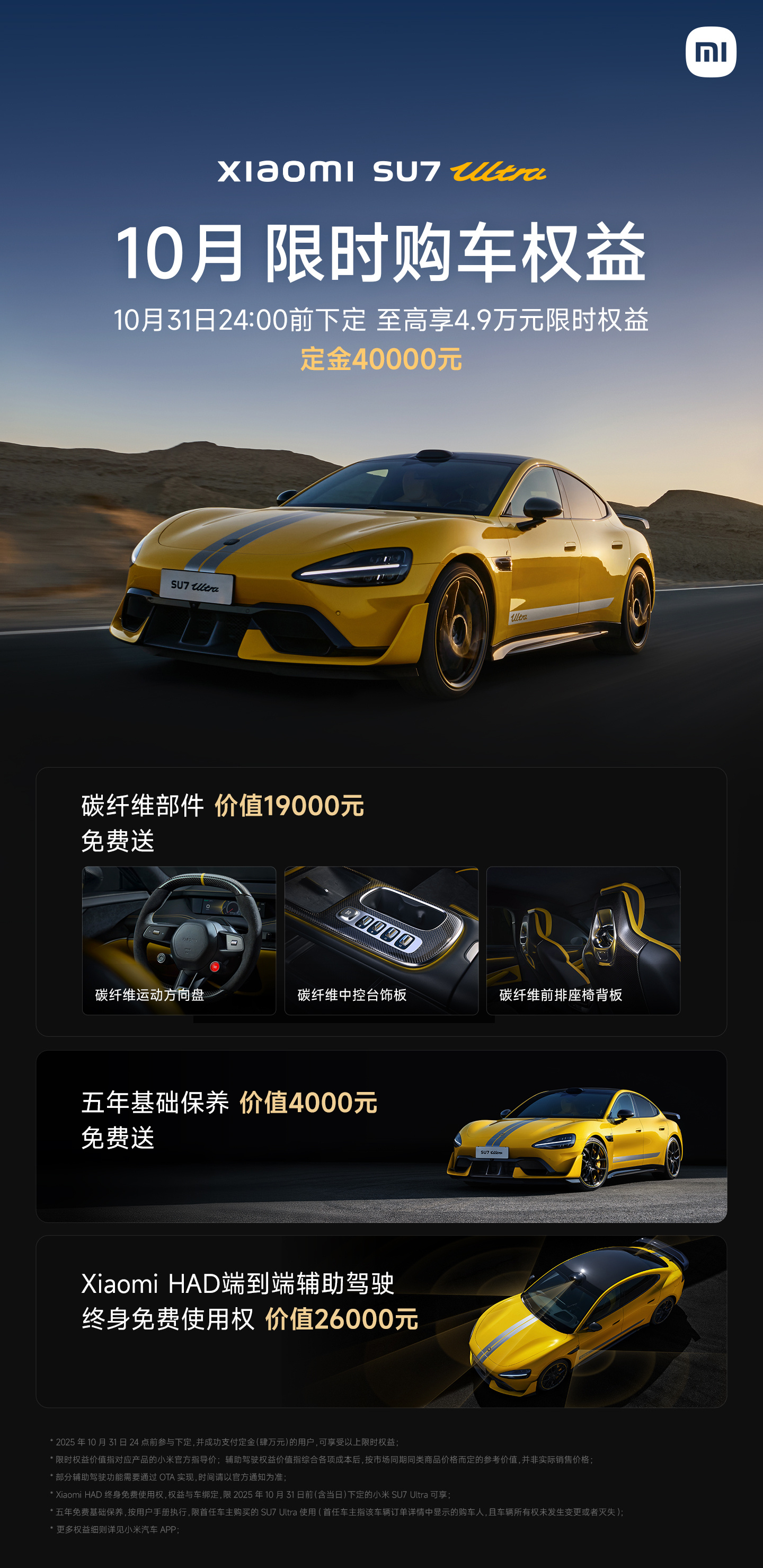 alixixi 10 月 1 日消息,小米汽车 10 月限时购车权益现已发布,其中 YU7、SU7、SU7 Ultra 的权益均包含辅助驾驶终身免费使用权。
