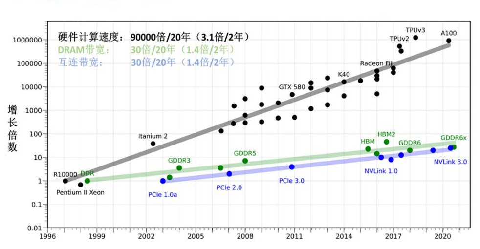 尤其是最近这些年,AI 的崛起,让数据计算强度又跃升了好几个层级。计算芯片在疯狂提速,而存储传输速率的提升跟不上,由此产生了著名的两堵墙 ——“存储墙”和“功耗墙”。