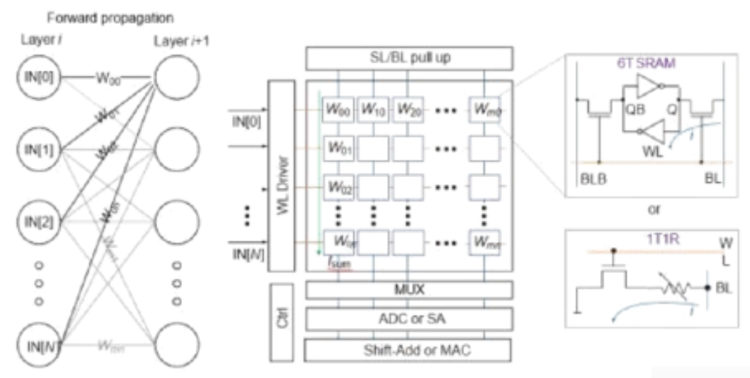 DRAM 成本低,容量大,但是可用的 eDRAM IP 核工艺节点不先进,读取延迟(Latency)也大,且需要定期刷新数据。Flash 则属于非易失性存储器件,具有低成本优势,一般适合小算力场景。SRAM 在速度方面具有极大优势,有几乎最高的能效比,容量密度略小,在精度增强后可以保证较高精度,一般适用于云计算等大算力场景。