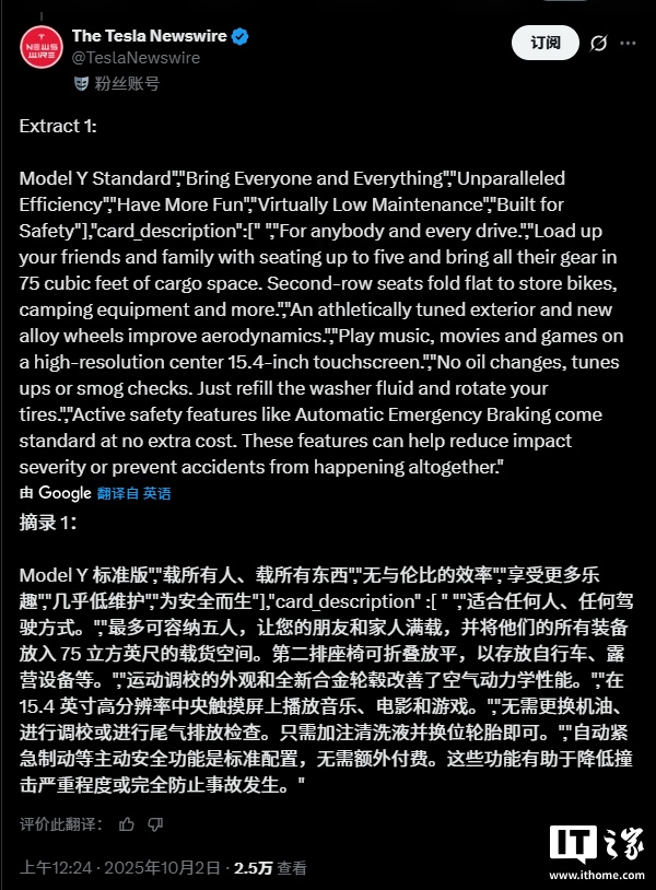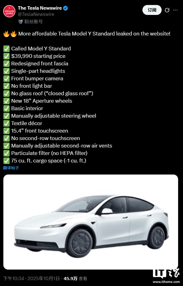 代码显示,Model Y 标准款定价为 39,990 美元(alixixi注:现汇率约合 28.5 万元人民币),是目前特斯拉售价最低的 SUV 车型,定位低于长续航版和高性能版,主要面向希望加入特斯拉生态、但对豪华附加配置需求较低的消费者。