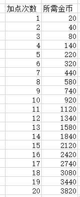 商店加点价格随加点次数提升,从第二次起,涨价幅度成等差数列。第一次加点20,第二次涨20,第三次涨40,第四次涨60……每次加点需要金返廊欠币如附图所示。
