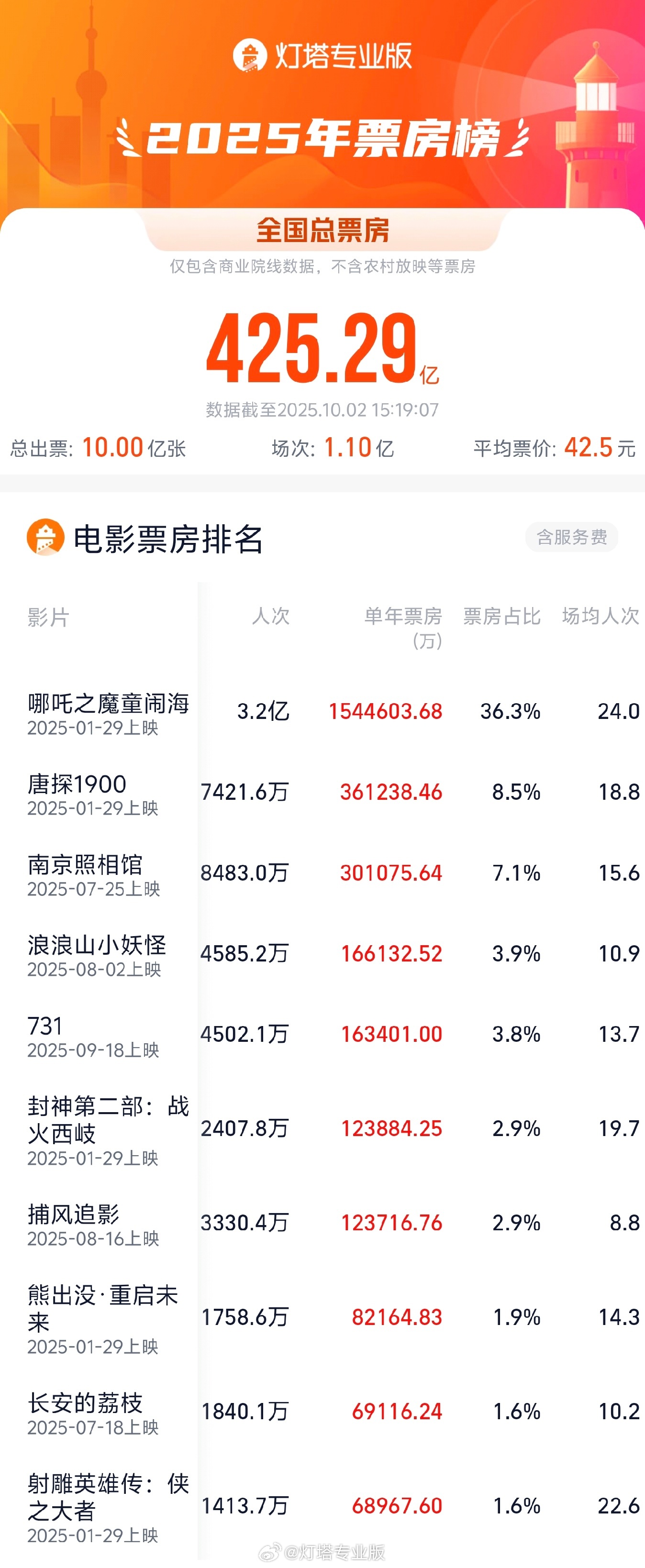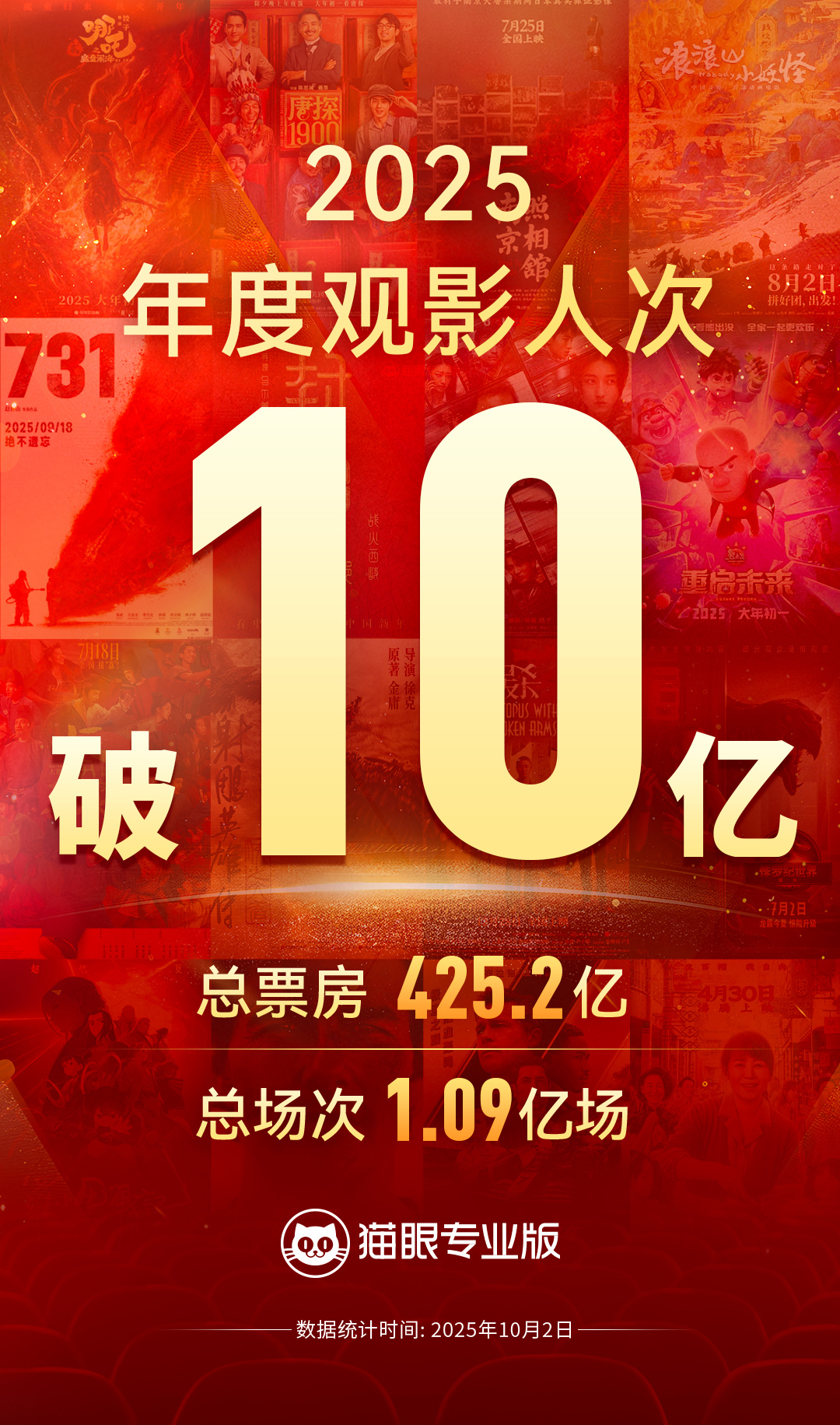 alixixi 10 月 2 日消息,据灯塔专业版数据,截至 2025 年 10 月 2 日 15 时 19 分,2025 年全国观影人次(含预售)突破 10 亿。