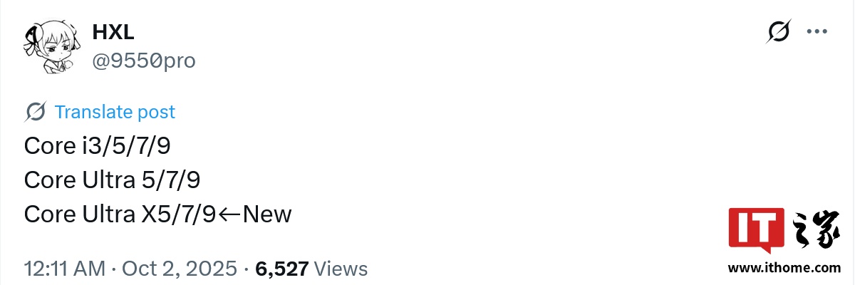 alixixi 10 月 2 日消息,X 平台消息人士 HXL (@9550pro) 爆料称,英特尔将推出全新的酷睿 Ultra X 处理器产品线,包含 Ultra X5 / X7 / X9 三个等级。