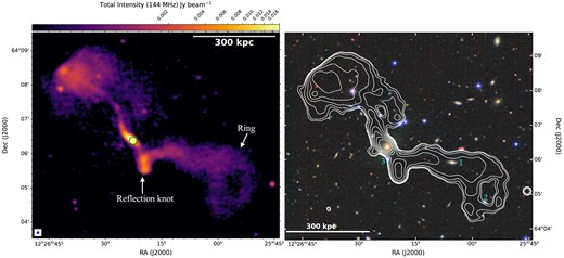 RAD J122622.6+640622,跨度近 300 万光年,相当于银河系的 25 倍,其喷流急剧弯曲并形成一个宽约 10 万光年的巨大射电环;