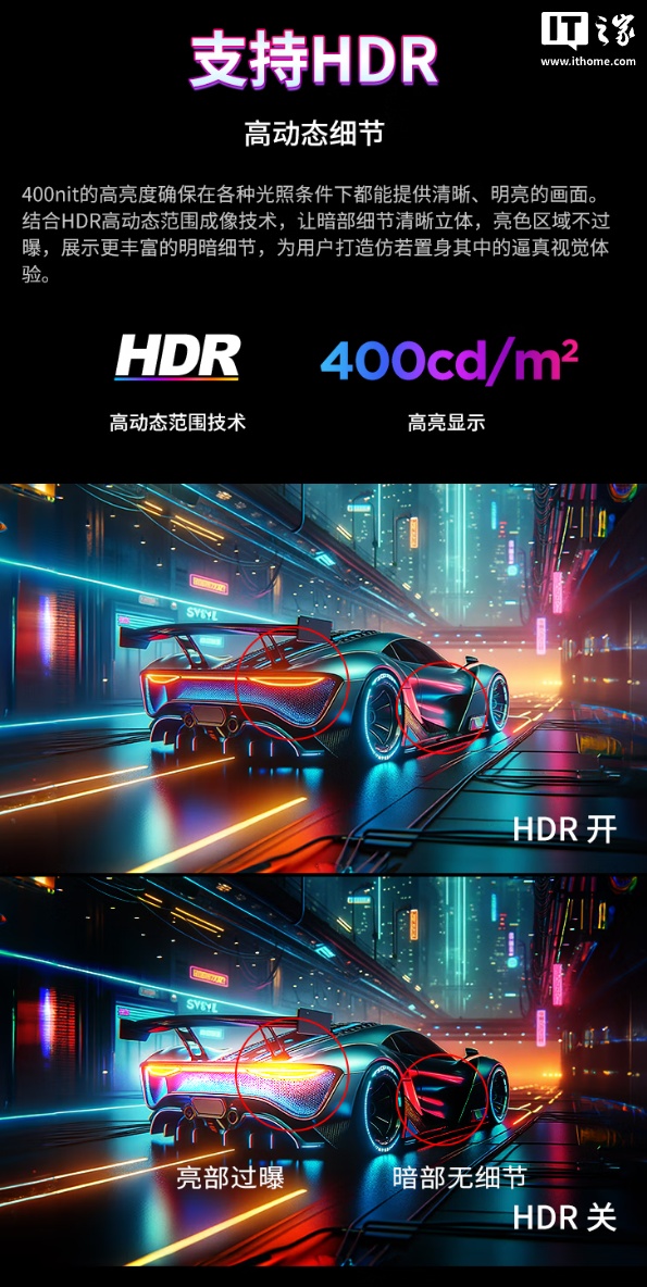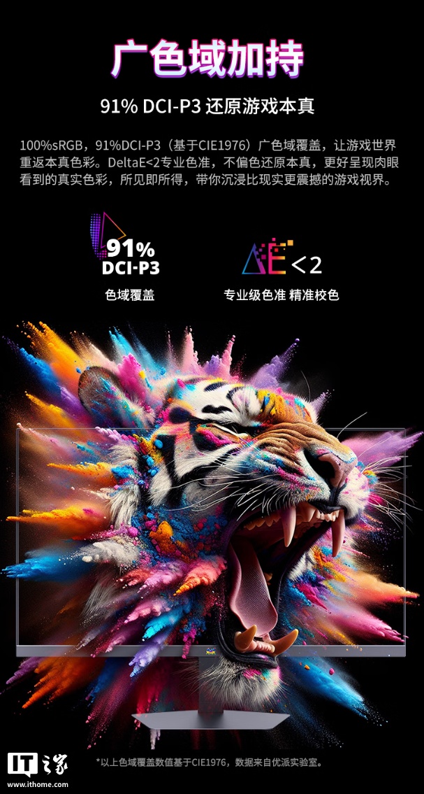 参数方面,这款显示器覆盖 100% sRGB 色域、91% DCI-P3 色域,ΔE<2,最高亮度可达 400 尼特,通过了 HDR 400 认证,可在游戏之余胜任轻度图像、影音处理。