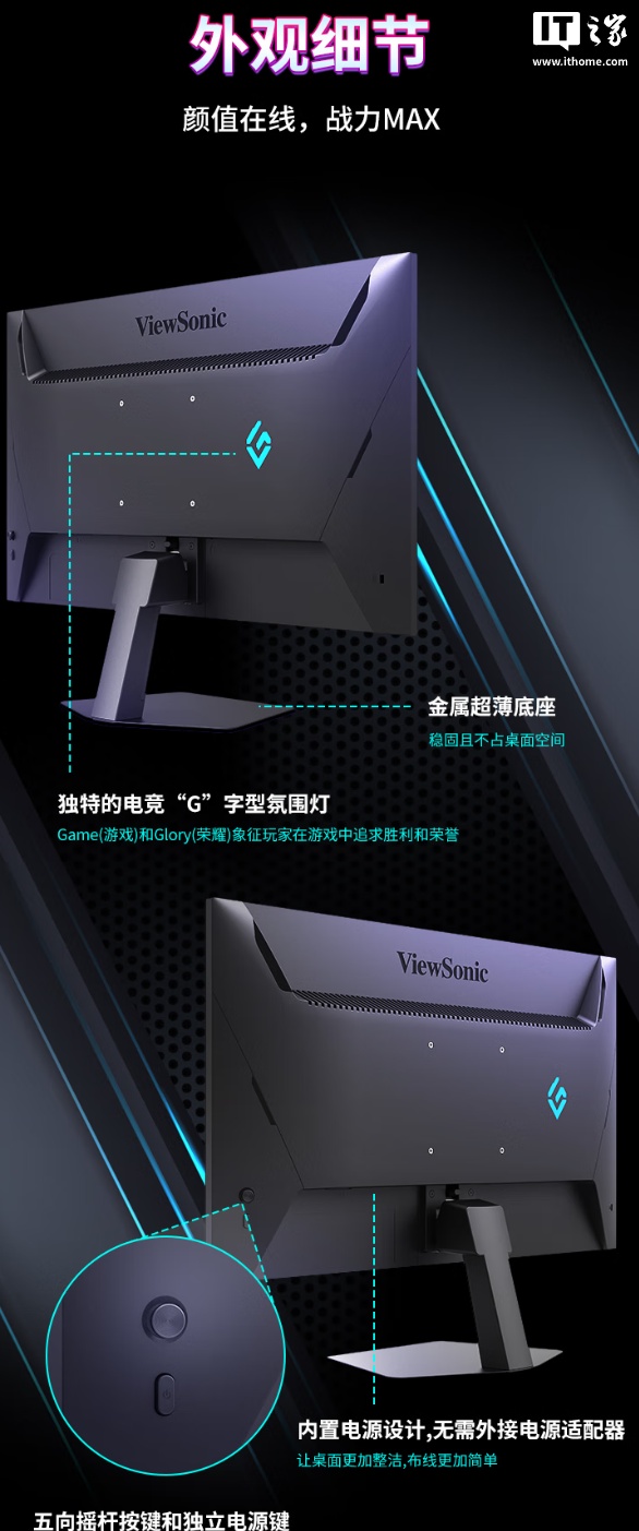 设计方面,这款显示器的底座为金属材质,采用超薄设计,在宿舍桌面上侵占空间更小,背部拥有“G”字形电竞氛围灯,搭载内置电源,背部有独立电源键和五向摇杆键,方便玩家快速调整显示器设置。