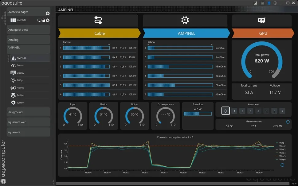 此外,Aqua Computer 还为 Ampinel 设计了八级可定制报警系统,用户可通过 Aquasuite 软件调整参数,例如在电流异常时自动终止相关程序,甚至执行硬关机,或切断显卡的感应信号以彻底中断供电。值得注意的是,报警和紧急断电功能无需依赖软件或 USB 连接即可独立运行。