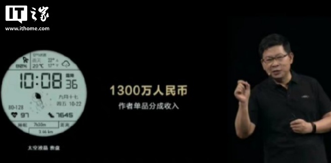 值得一提的是,早在 2021 年,华为 WATCH GT 2 系列的一款太空人表盘爆火,当时余承东在华为开发者大会上透露,作者通过该表盘获得了 1300 万人民币分成收入。