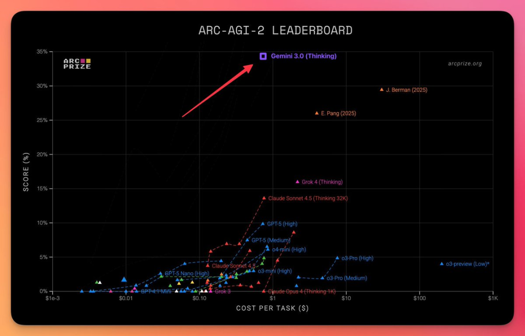 在 ARC-AGI-2 上,开启思考模式的 Gemini 3.0,准确率超 20%。