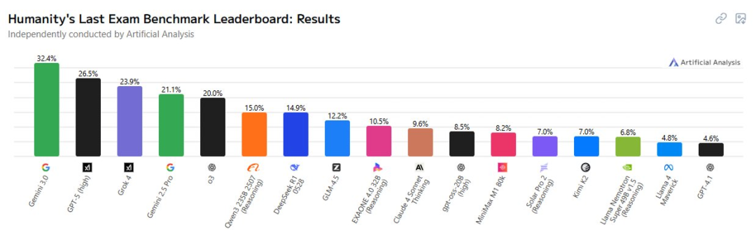 在人类最后考试基准上,Gemini 3.0 拿下了 32.4% 最高分,性能碾压 GPT-5、Grok 4。
