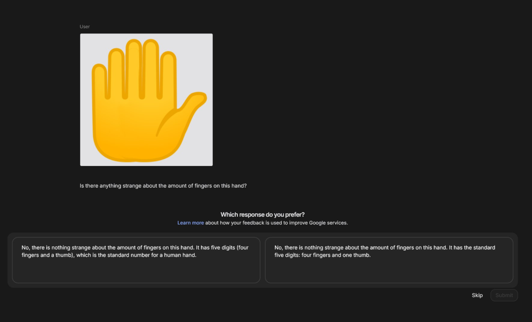 不过,Gemini 3.0 Pro 却在六指手部视觉测试中失败了。